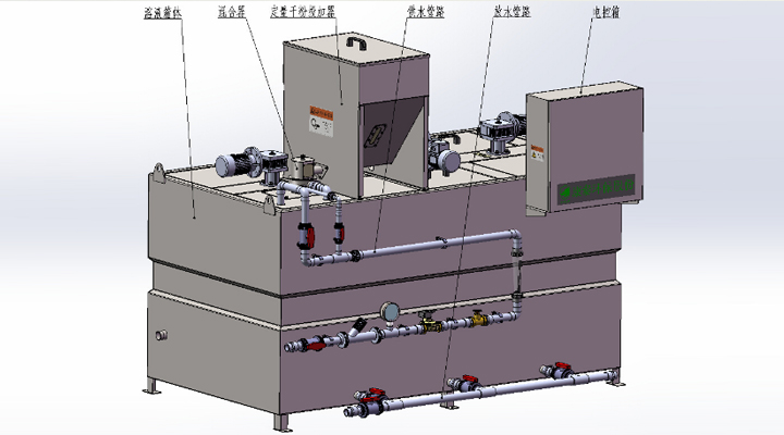 工作流程:料斗中的粉狀劑經(jīng)定量供料裝置送入混合器中,與水進(jìn)行混合后進(jìn)入溶液箱中,混合液經(jīng)攪拌后形成均一濃度的溶液,再進(jìn)入貯液箱內(nèi),經(jīng)計(jì)量泵投加至加點(diǎn)。